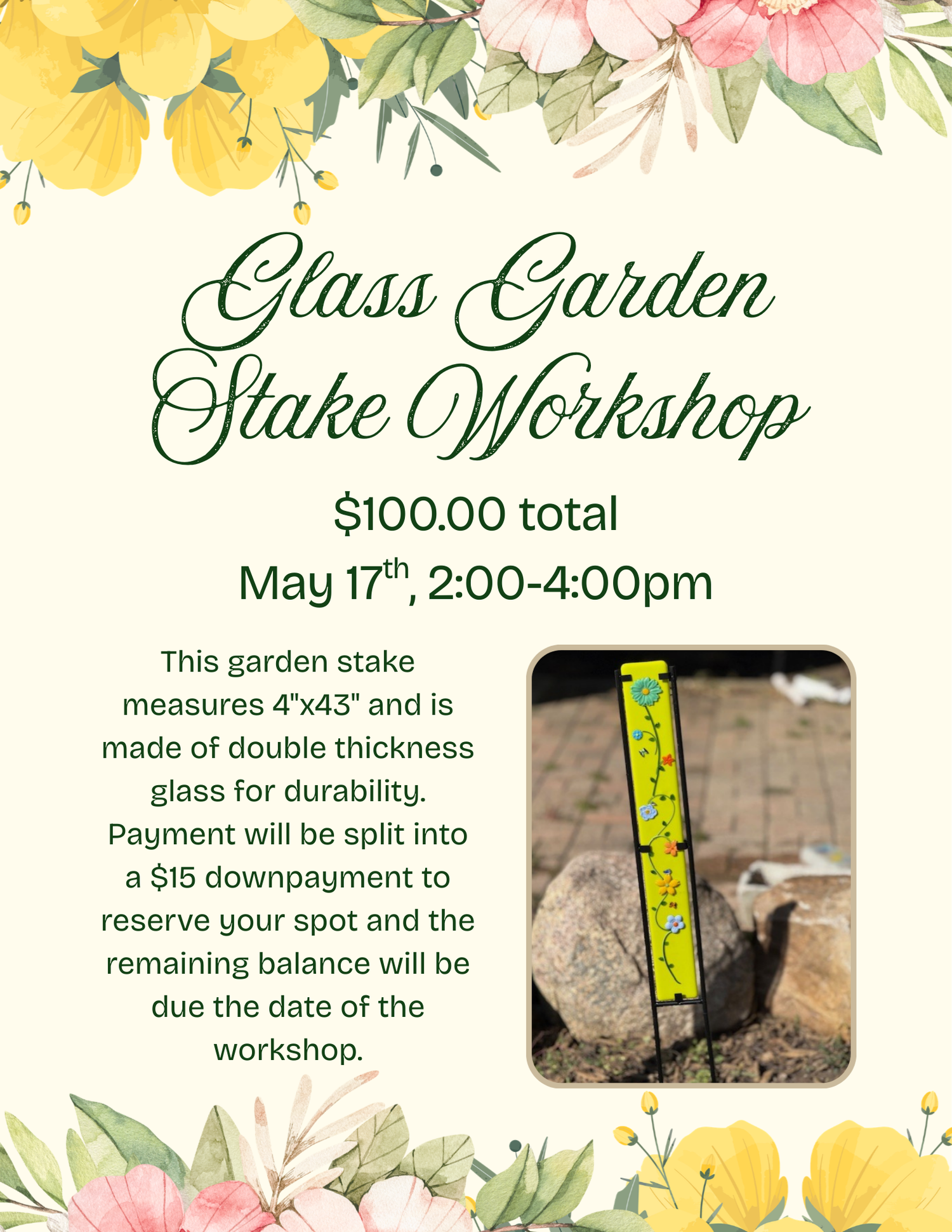 We will be partnering with Barb Dalenberg for this wonderful workshop! This glass garden stake measuring 4"x43" is made of double thickness glass for durability and will make a great statement in your yard or flower garden! Each stake will be a custom design of your own choosing, and the color of the glass will vary depending on availability.