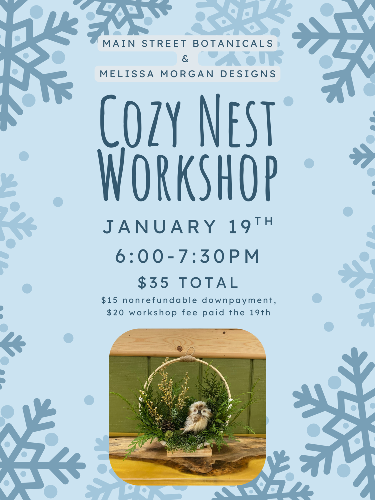 Anyone Whooo's ready for winter will love this crafting workshop with Melissa Morgan Designs! In this workshop, you will create a hoop decoration that can be hung or placed on a stand made with a mix of real and faux accents with an adorable little owl in the center!