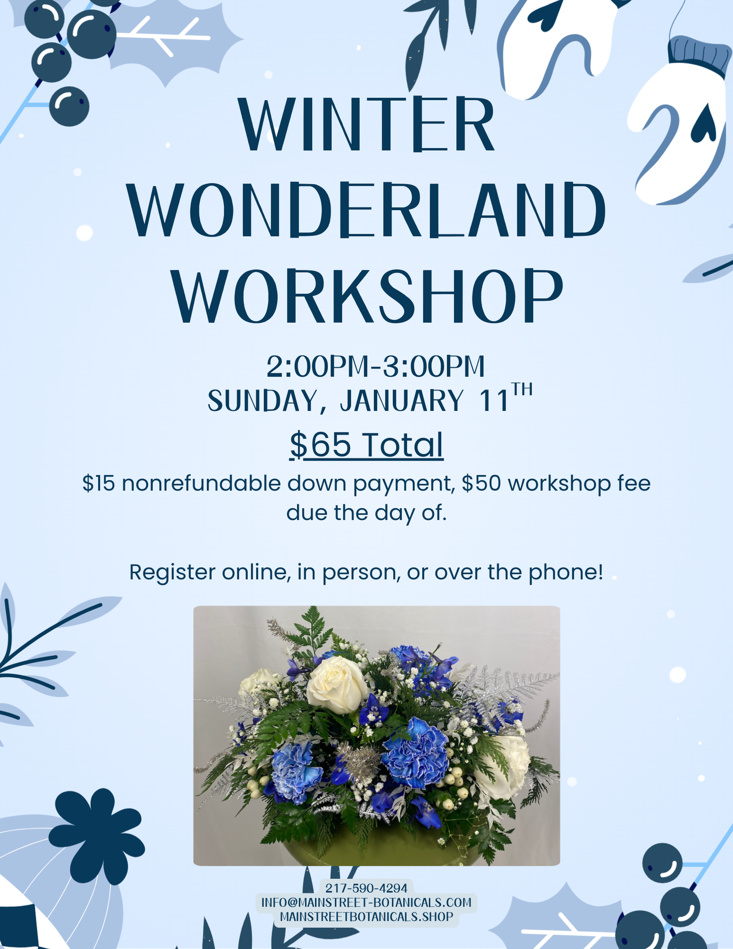 Express your creative side and explore the world of arranging flowers during this winter floral design workshop! You will learn how to make an oval centerpiece with featured blues, whites, evergreens, and ferns during this workshop!