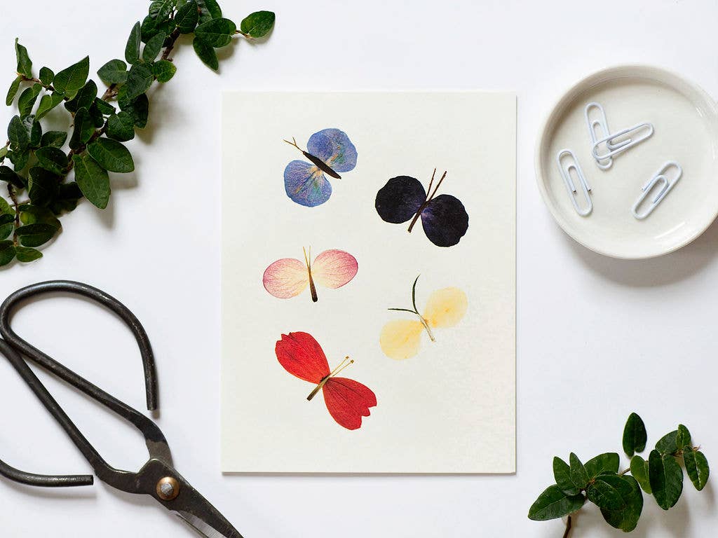 A whimsical card designed entirely from pressed flowers grown in a home garden! Featuring the blossoms of Hydrangea, Johnny Jump Ups and Blanket Flower. The perfect card for a thank you note, just because card or any occasion where the symbol of a butterfly — endurance, change, hope and life — is appropriate. A high-resolution digital print of an original piece of art. A2 card measures approximately 4.25 x 5.5 inches. Includes a matching envelope. An explanation of the botanicals used is printed on the back. Printed on Forestry Stewardship Council-certified card stock. Blank inside for all reasons and seasons. Mother Nature ... but with a lot more personality!