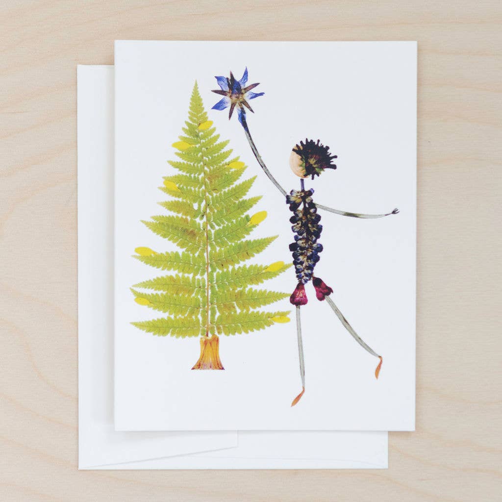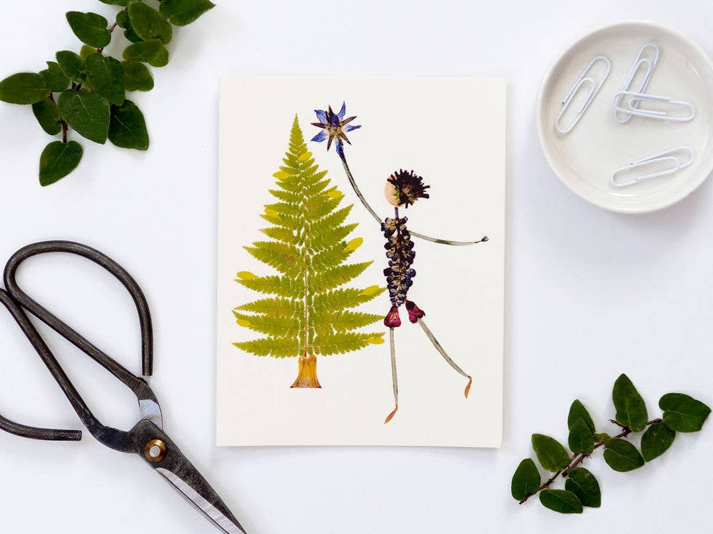 A whimsical card designed entirely from pressed botanicals grown in a garden! Featuring the blossoms of Blue Salvia, Borage, Pincushion flower and Coral Bells as well as a free and herbs, it's a playful card for the holidays! A high-resolution digital print of an original piece of art. A2 card measures 4.25 x 5.5 inches. Includes a matching envelope. An explanation of the botanicals used is printed on the back. Printed on Forestry Stewardship Council-certified card stock. Blank inside for a personal special message. Packaged in an acid-free envelope to protect against shop wear. Mother Nature ... but with a lot more personality!