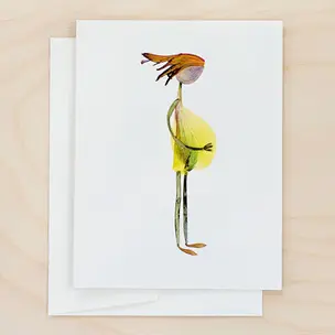 This sweet figure is a print of an original pressed botanical design, created from the blossoms of crocosmia, bleeding heart and Peruvian lily. A high-resolution digital print of an original piece of art. A2 card measures approximately 4.25 x 5.5 inches. Includes a matching envelope. An explanation of the botanicals used is printed on the back. Printed on Forestry Stewardship Council-certified card stock. Blank inside for all reasons and seasons. Mother Nature ... but with a lot more personality!